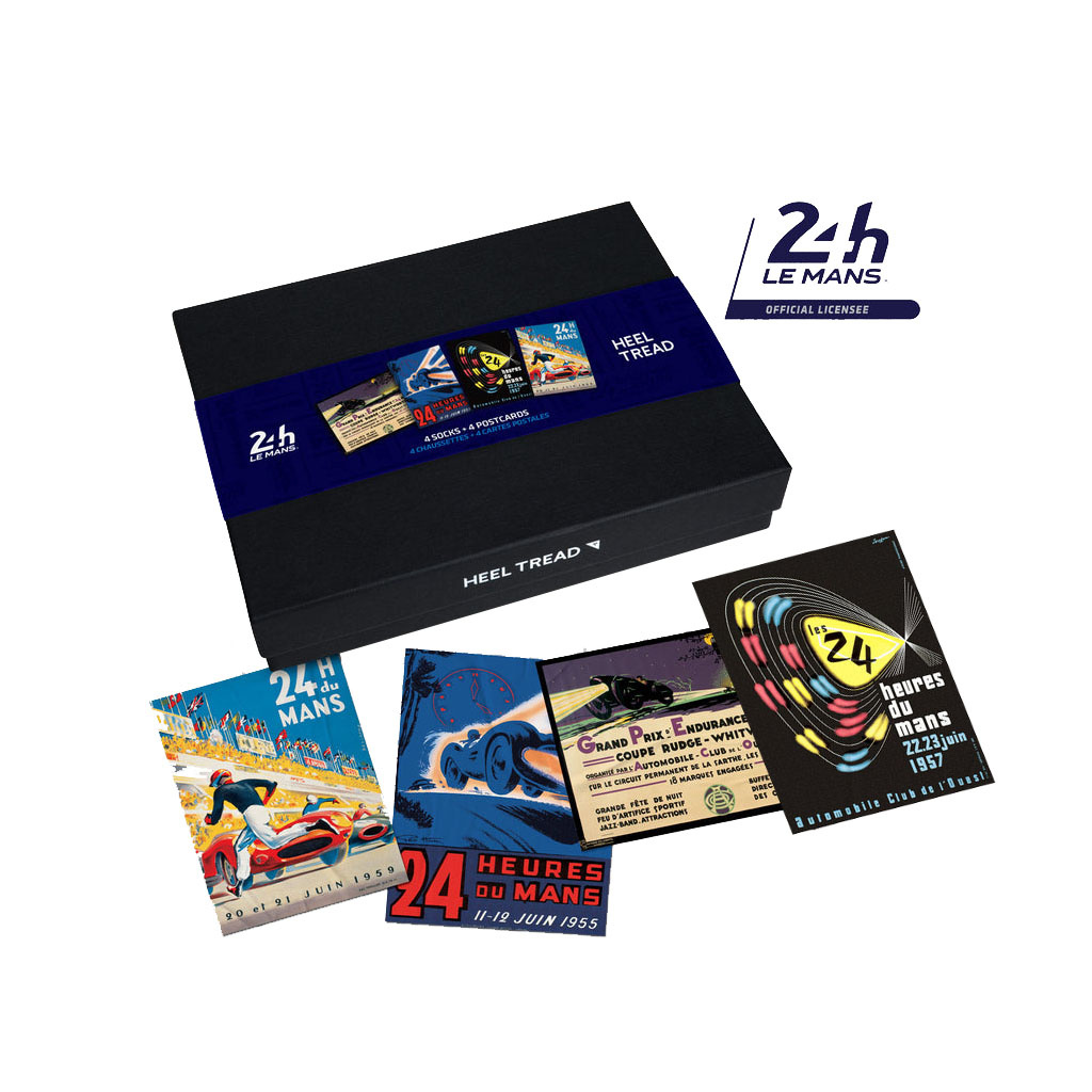 Dárkový box obsahující 4 páry ponožek Heel Tread pro všechny fanoušky motorsportu. Tato speciální edice oslavuje čtyři legendární ročníky 24 hodin Le Mans – 1923, 1955, 1957 a 1959 prostřednictvím jedinečné reinterpretace původního plakátu. Balení obsahuje 4 páry prémiových bavlněných ponožek a 4 sběratelské pohlednice v krásné krabičce na míru.