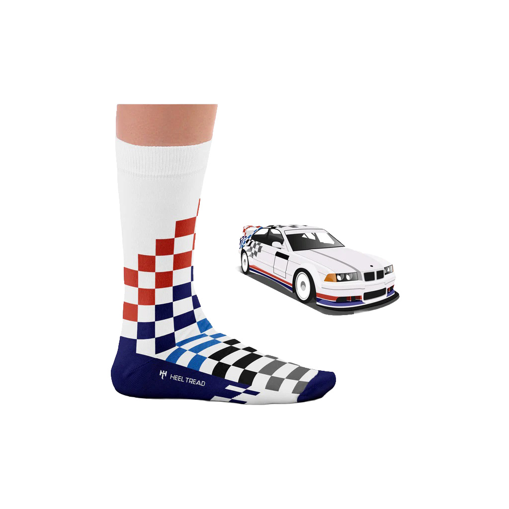 Ponožky značky Heel Tread jsou určeny pro všechny fanoušky motorsportu, kdy každý jeden z modelů je inspirován právě detaily jednotlivých vozidel. Tyto jsou inspirovány vozem BMW M3 GTR E36.