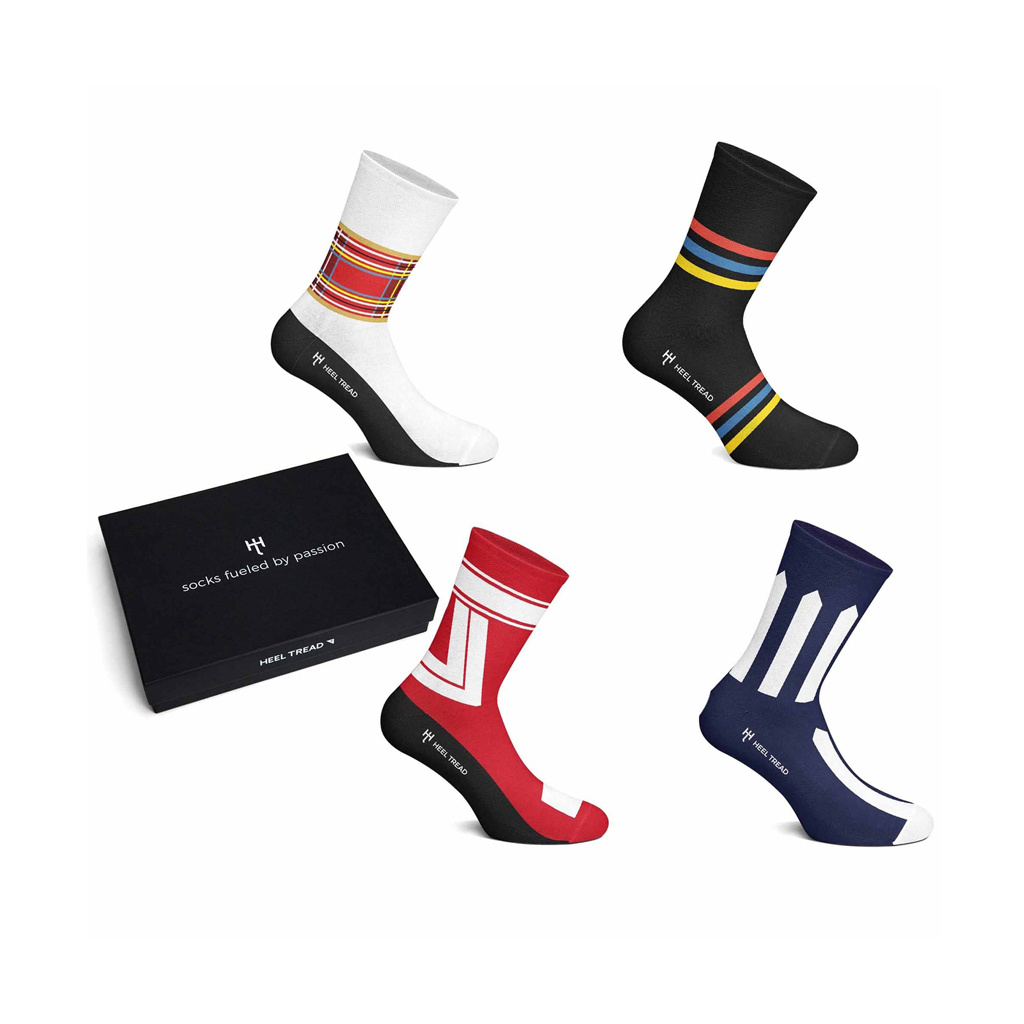Dárkový box obsahující 4 páry ponožek Heel Tread pro všechny fanoušky motorsportu. Tato speciální edice uctívá legendární piloty Formule 1 – Grahama Hilla, Jamese Hunta, Nikiho Laudu a Jackie Stewarta prostřednictvím ikonických designů jejich helem.